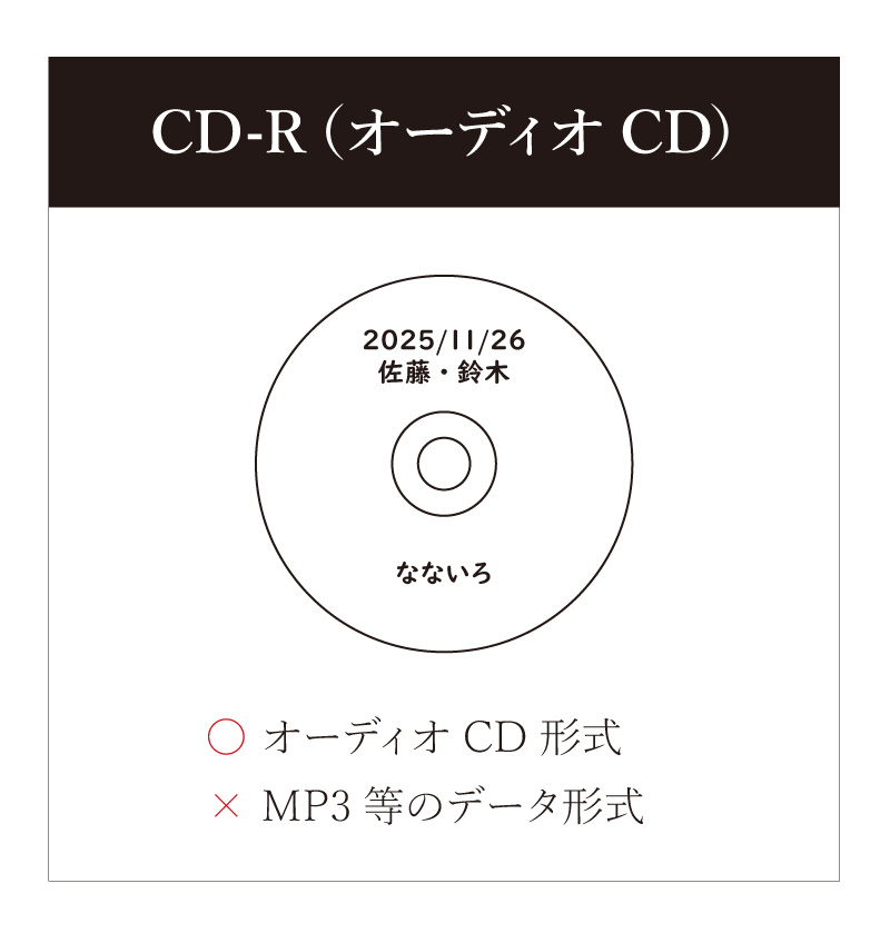 ・CD-Rの盤面に油性マジックで披露宴日・ご両家名・曲名を記載のうえ、ケースに入れてお持ちください。