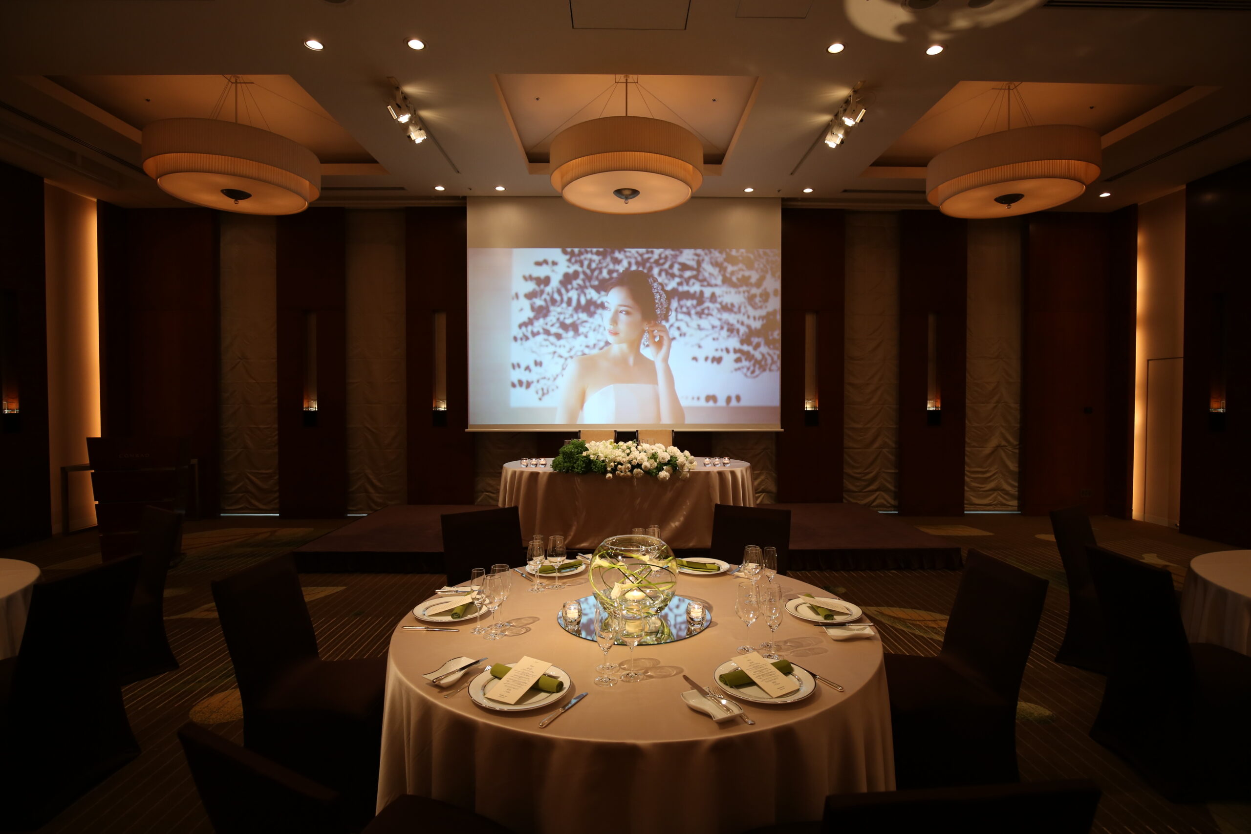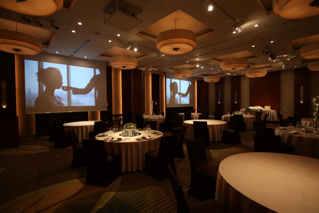 スクリーンは1面あたり150inchで、メインテーブル後方1面